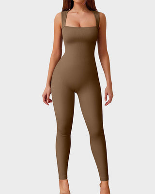 Geribde Mouwloze Workout Jumpsuit met Vierkante Hals